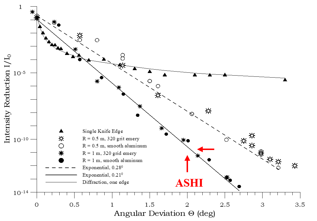 The above image shows laboratory measurements of the reduction of stray light. The corral is illuminated from below the ASHI field of regard. Two corrals, one (R=0.5m) more curved than the other (R=1.0m) which contain both rough and smooth surfaces, are compared with the diffraction of a single knife edge. The corral provides a very dark umbral region for full quality performance when slightly more than a hemisphere is free of background-light sources (including bright illuminated spacecraft apendages). Performance of the baffle is insensitive to even several tenths of a degree misalignment of the corral-and-optical-system axis relative to the Sun and other bright objects. Performance is also insensitive to the curved baffle's surface color, smoothness, and potential contamination. In tests, 320-grit sandpaper was attached to the curved 2 degree baffle and was proved as effective as a smooth surface in reducing stray light.
